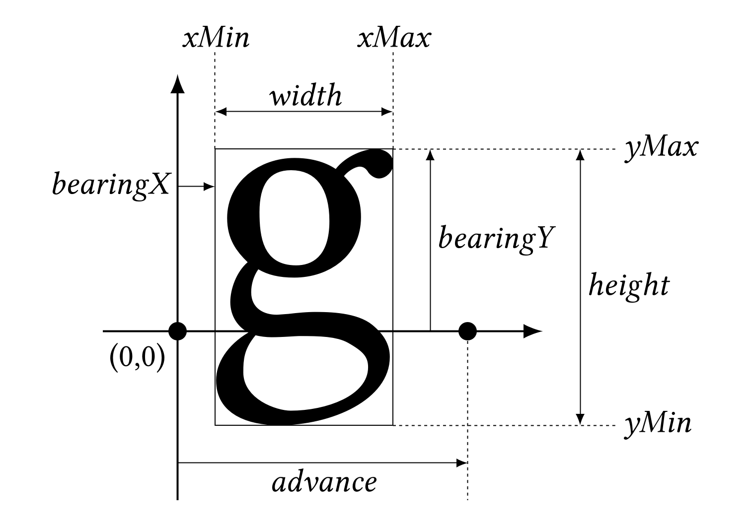因此,我们需要从 Metrics 中提取每个字形的基本信息。以横排为例,取每个字形自己的宽度来绘制 viewBox,高度还是通过上下沿线相减来计算。这样在排版时就可以得到想要的效果了: