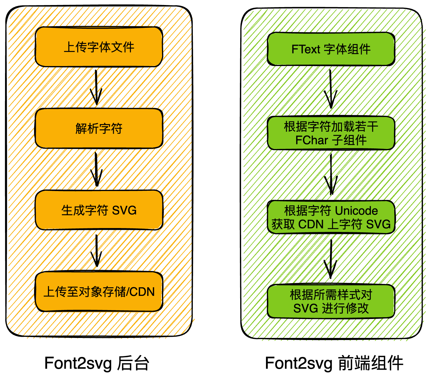 整体流程如下图,页面开发阶段,在 Font2svg 后台预先上传字体文件,解析所有字符的 SVG,并预先上传至对象存储/CDN 上。在页面加载时,通过前端组件传入需要渲染的字符和对应字体的配置,从 CDN 拉取特定字体特定字符的 SVG,并根据样式对字符的 SVG 进行二次编辑,复原字体上色、描边、下划线等样式。