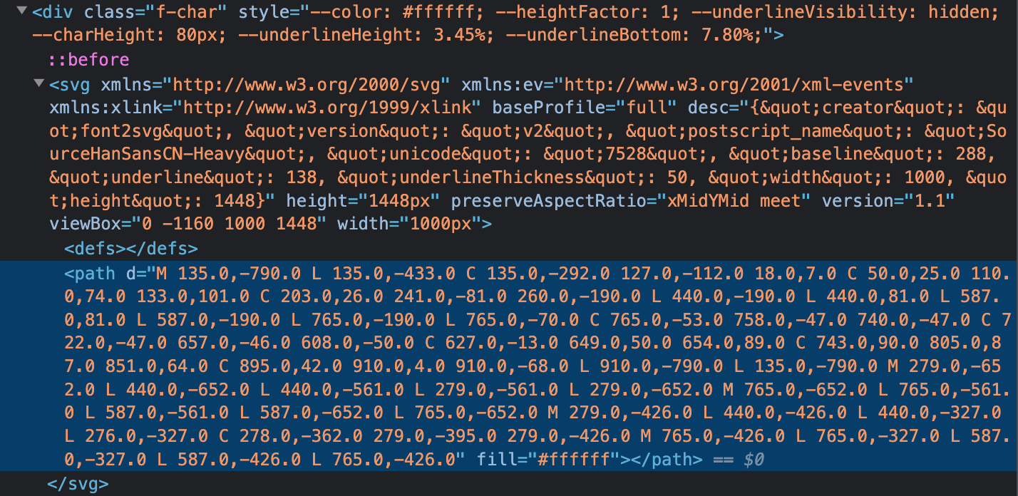 我们在前端去加载 SVG 字体文件的时候,并不是直接通过 img 标签的方式来引入 SVG,而是在前端组件中去下载 SVG 文件内容并解析 DOM 对象,然后根据需要去修改对应的属性或添加额外的样式,例如修改 pathfill 属性来设置颜色,修改完样式后再把修改后的 SVG 标签直接插入到文档中。还有一些字体全局的样式信息,例如下划线的位置、粗细等,在不同的字体中,也是有不一样的配置的。我们需要想办法把这些信息也通过 SVG 传递过来。解决方法也很简单,我们在 SVG 的根节点上添加一个自定义的属性,将所需传递的信息转成 JSON 格式然后塞到这个属性里,前端在解析 SVG 的 DOM 时,把这个属性中的数据取出来解析并渲染就可以了。