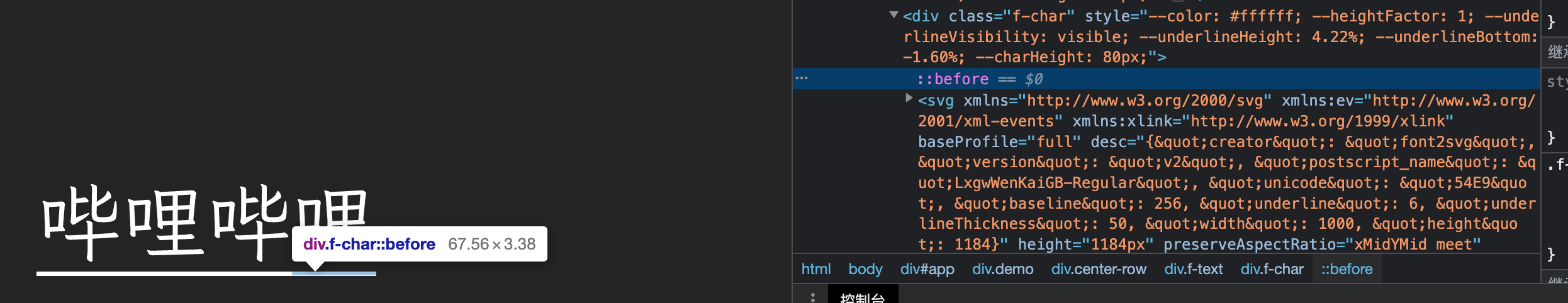 上面截图中,underlineunderlineThickness 就分别代表了下划线位置和粗细信息,在解析到这两个信息后再做一些转换处理,可通过 ::before 伪元素来绘制下划线: